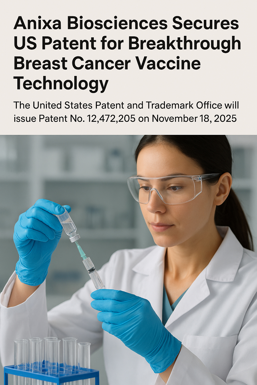 Anixa Biosciences, Inc. (NASDAQ: ANIX) has received a new U.S. patent for its innovative breast cancer vaccine technology. The United States Patent and Trademark Office (USPTO) will officially issue Patent No. 12,472,205 on November 18, 2025, marking a major step forward for the company’s preventive cancer program.